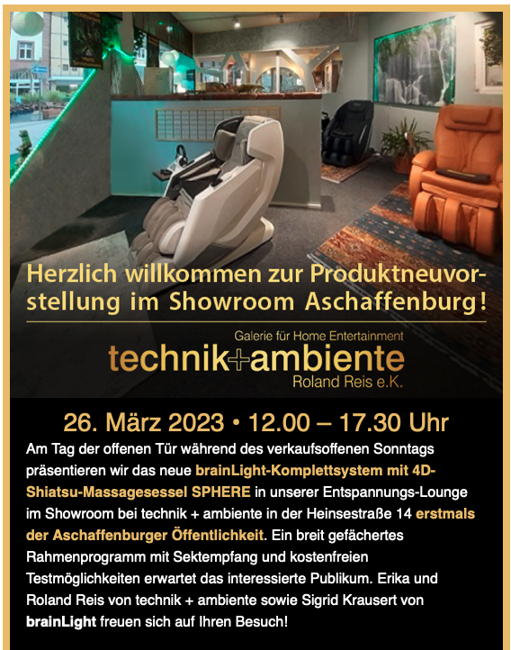 Der Showroom in der Fa. Technik + Ambiente im Herzen von Aschaffenburg lädt Sie dazu ein, brainLight-Tiefenentspannung kennenzulernen und alle aktuellen brainLight-Systeme zu testen.